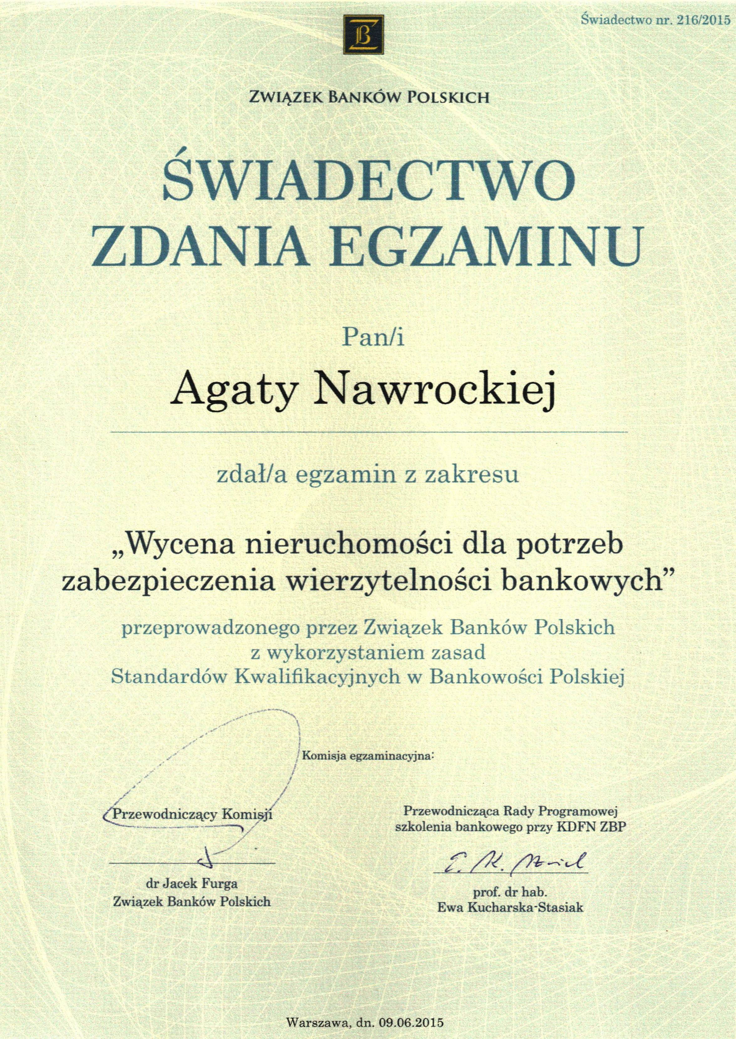 Po ukończeniu przeszło 2-letniej praktyki zawodowej z wyceny nieruchomości w Agencji Nieruchomości i Budownictwa „PROMIKS” Sp. z o.o. z siedzibą w Katowicach i pozytywnym przejściu postępowania kwalifikacyjnego w dziedzinie gospodarki nieruchomościami, otrzymałam nadane przez Ministra Infrastruktury i Rozwoju uprawnienia zawodowe w zakresie szacowania nieruchomości numer 5962, uzyskując tym samym tytuł Rzeczoznawcy Majątkowego.