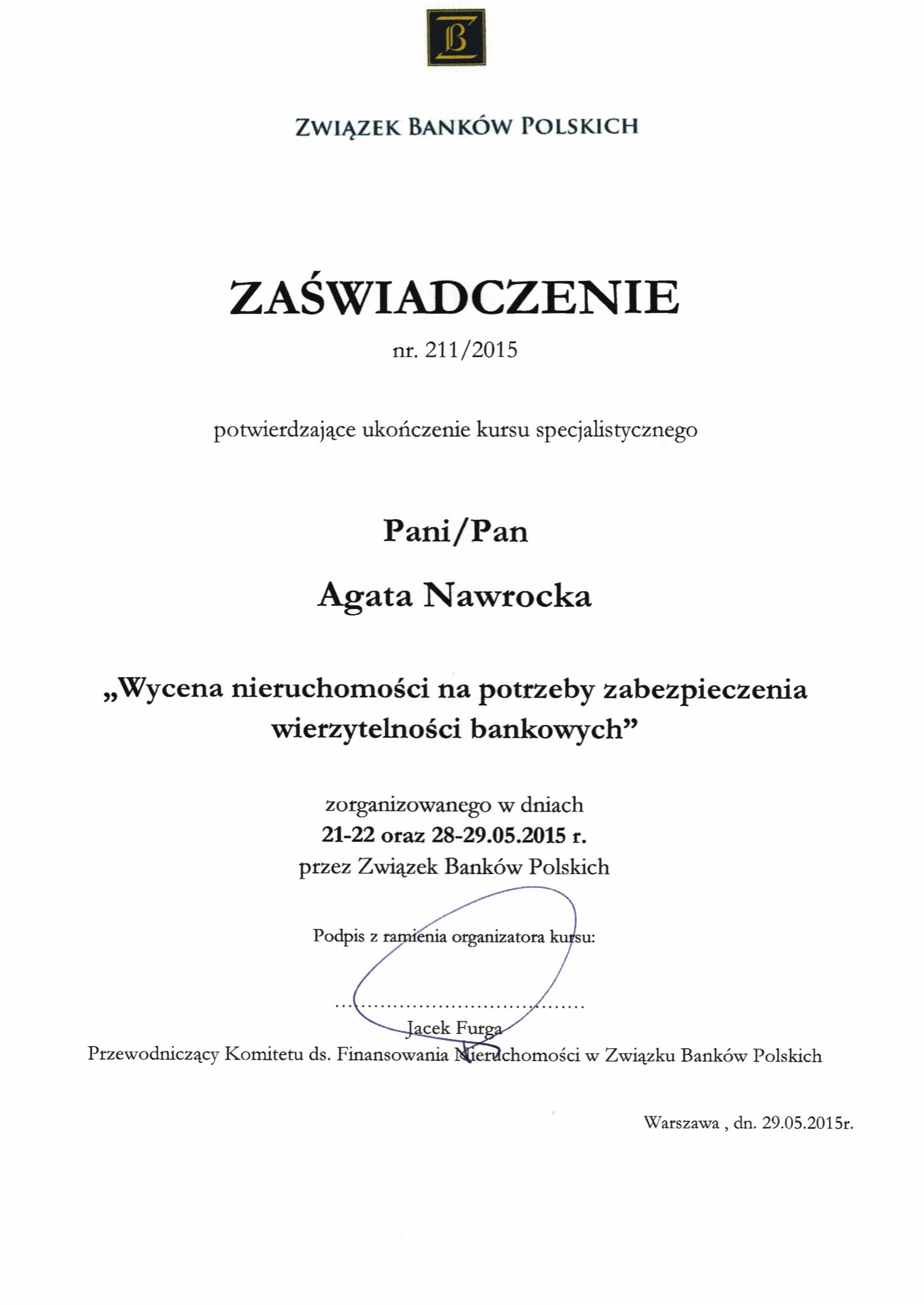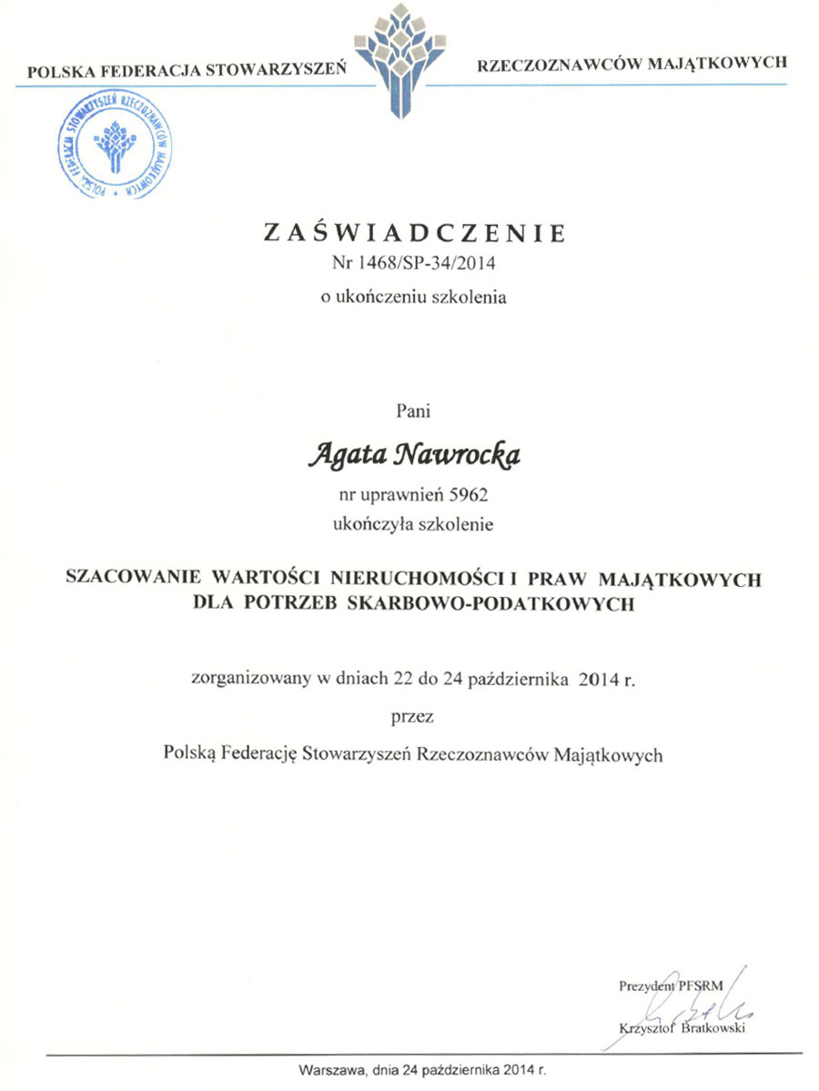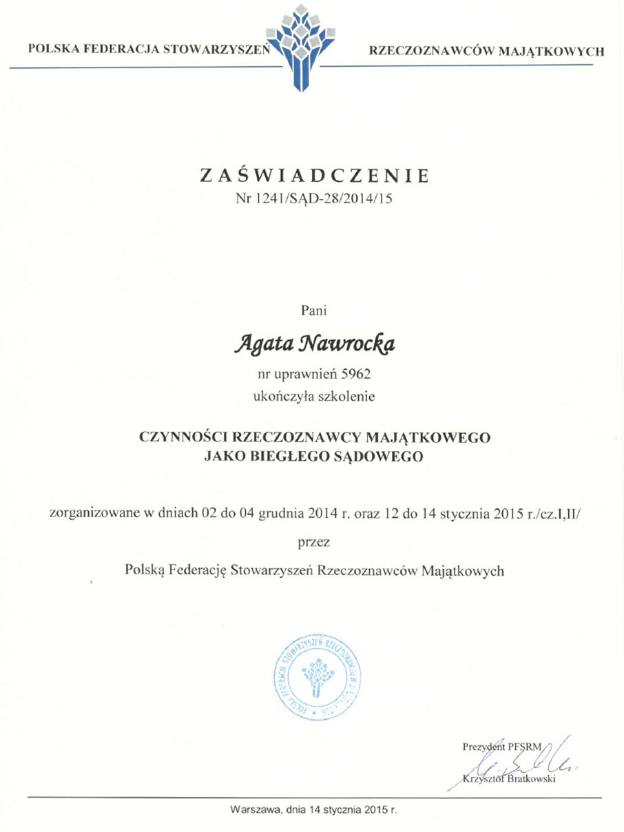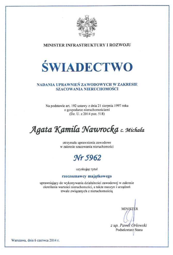 Agata Nawrocka – Rzeczoznawca Majątkowy (nr uprawnień 5962).